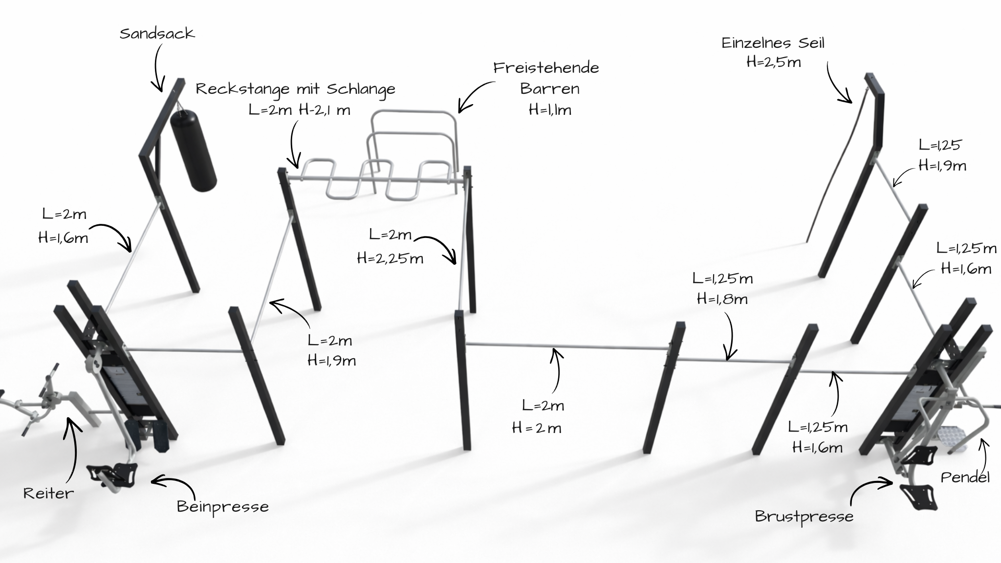Das Multi Outdoor Park Set ist vollständig konfigurierbar. An den Pylonen können verschiedene Fitnessstationen aus der FIT-Serie befestigt werden, sodass sich das Set individuell an die Anforderungen des jeweiligen Projekts anpassen lässt. Die endgültige Konfiguration kann beliebige kompatible Geräte umfassen, nicht nur die in der Visualisierung dargestellten.