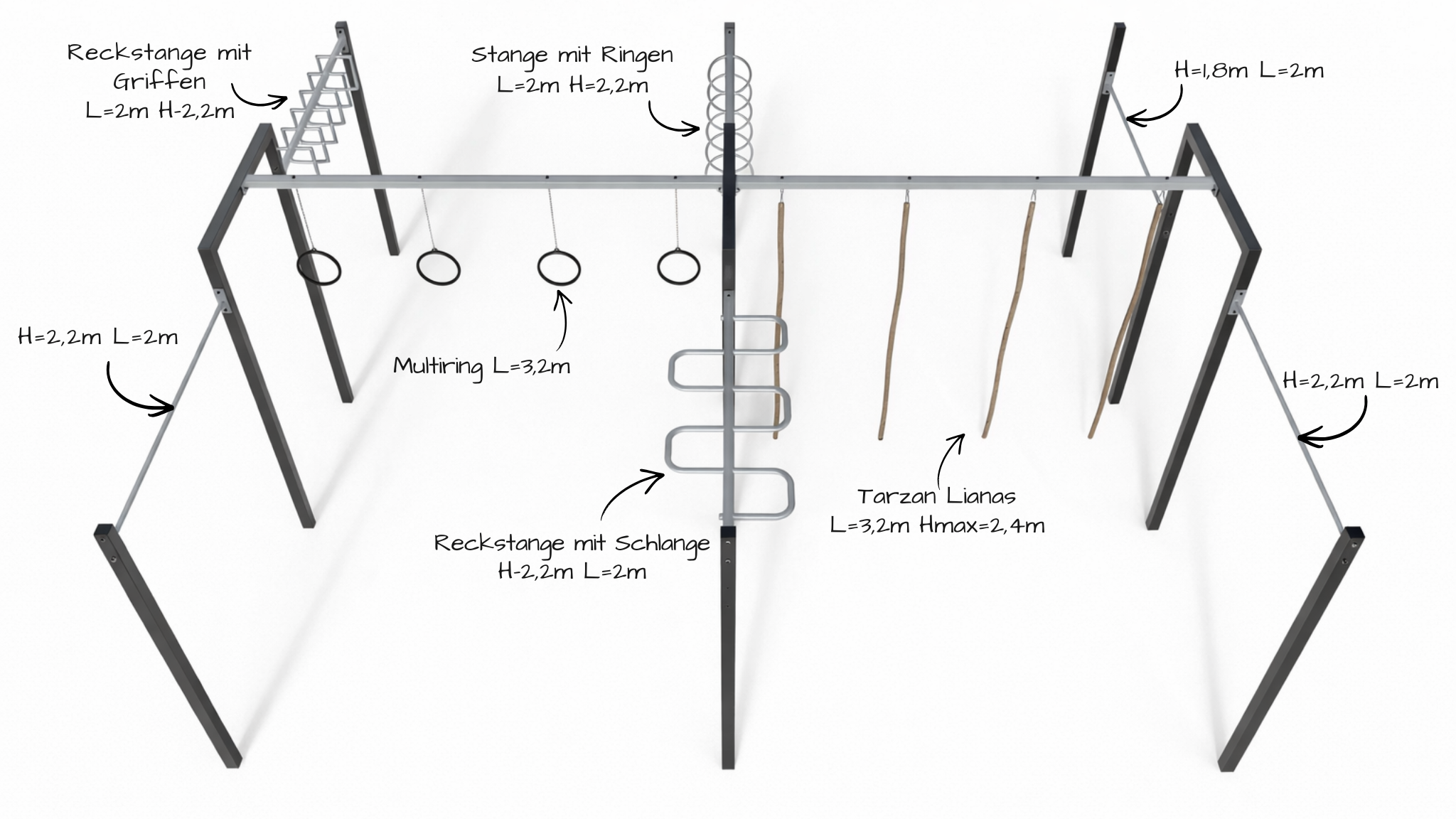 Das Set umfasst die folgenden Street-Workout- und Ninja-Track-Stationen:
