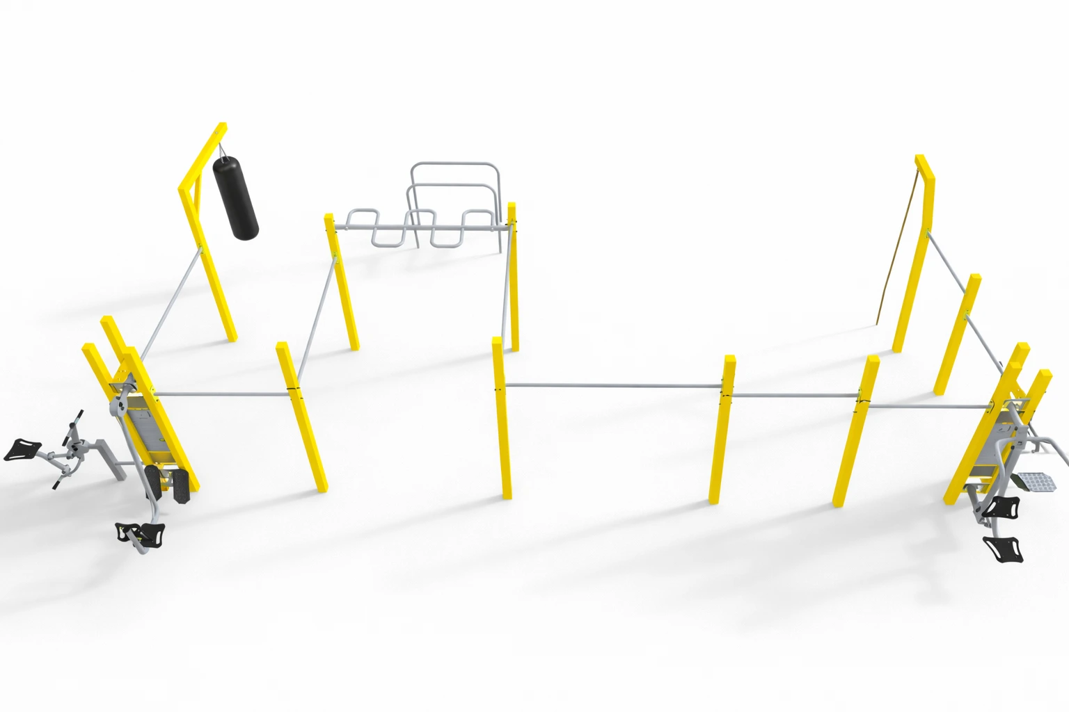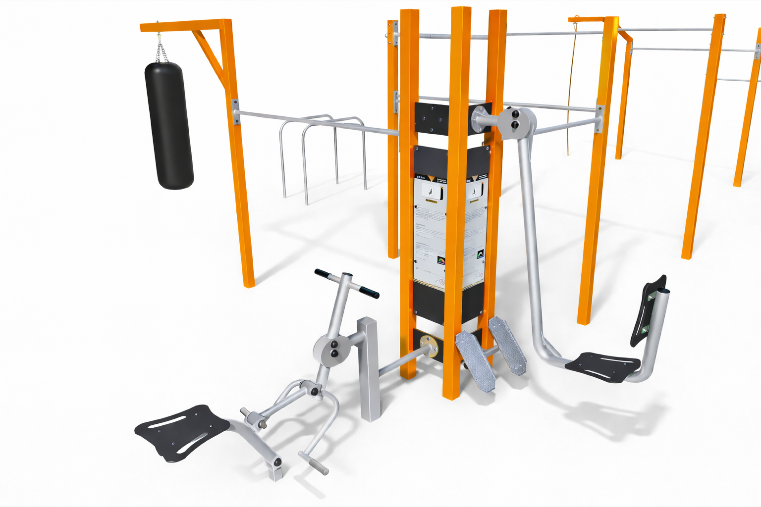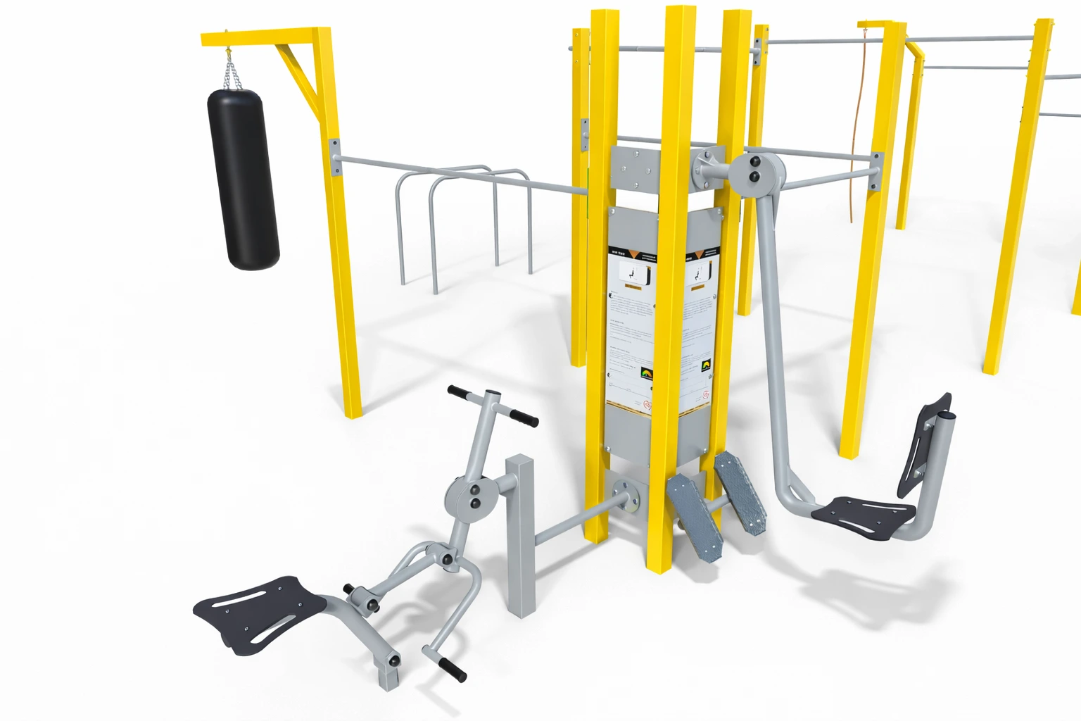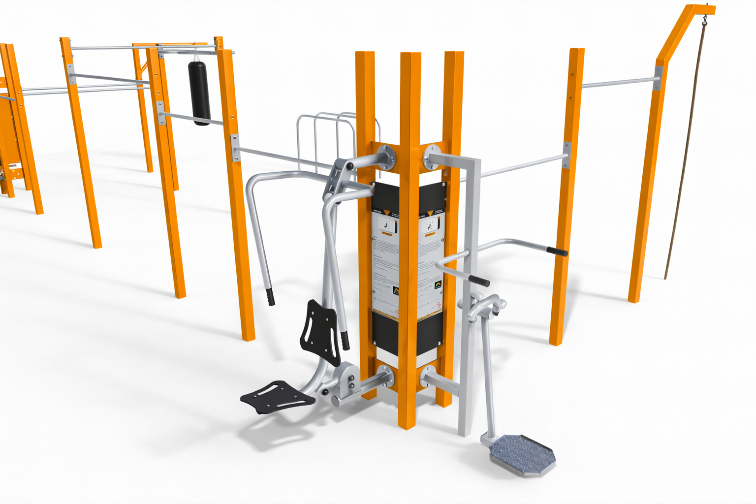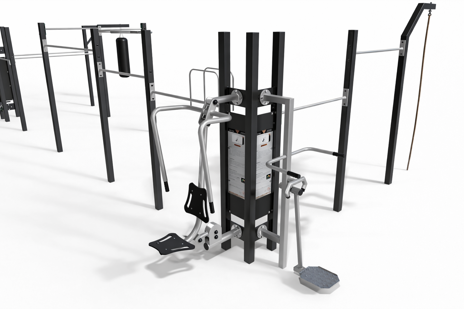 The Multi Outdoor Park set is fully configurable. Different fitness stations from the FIT series can be attached to the pylons, allowing the set to be customized according to the project needs. The final configuration may include any compatible machines, not only the ones shown in the visualization.