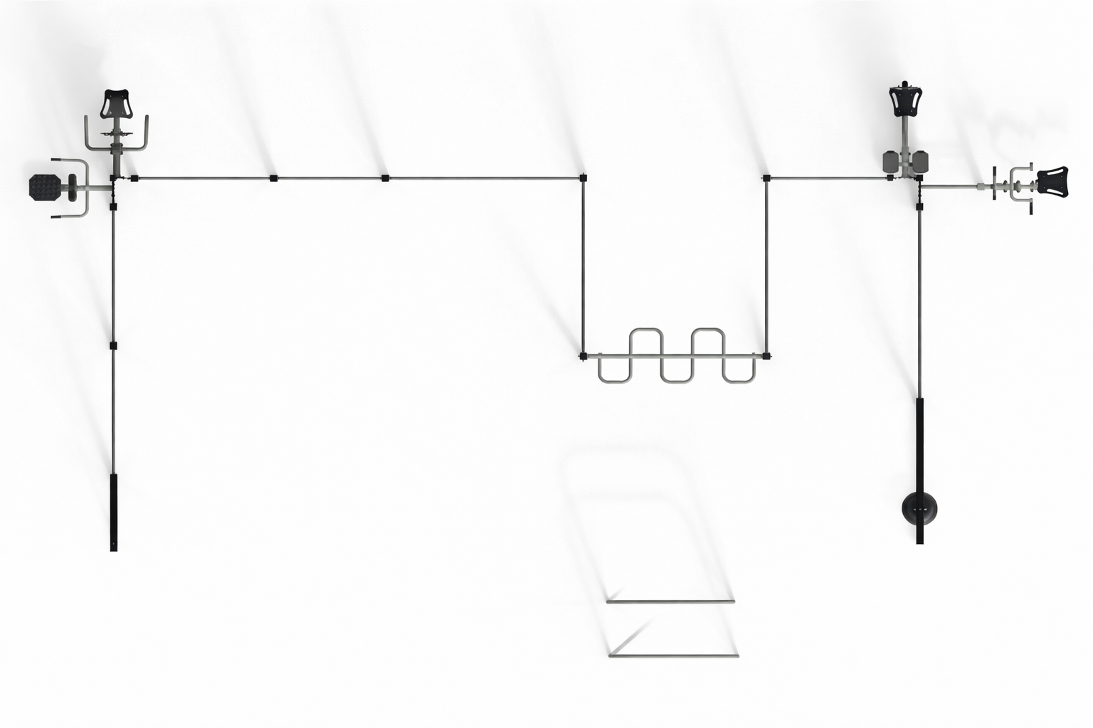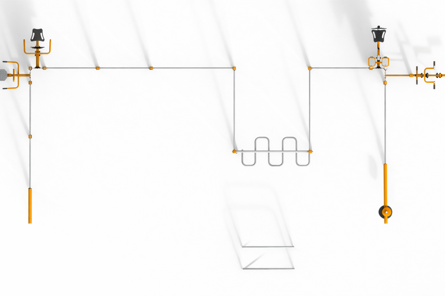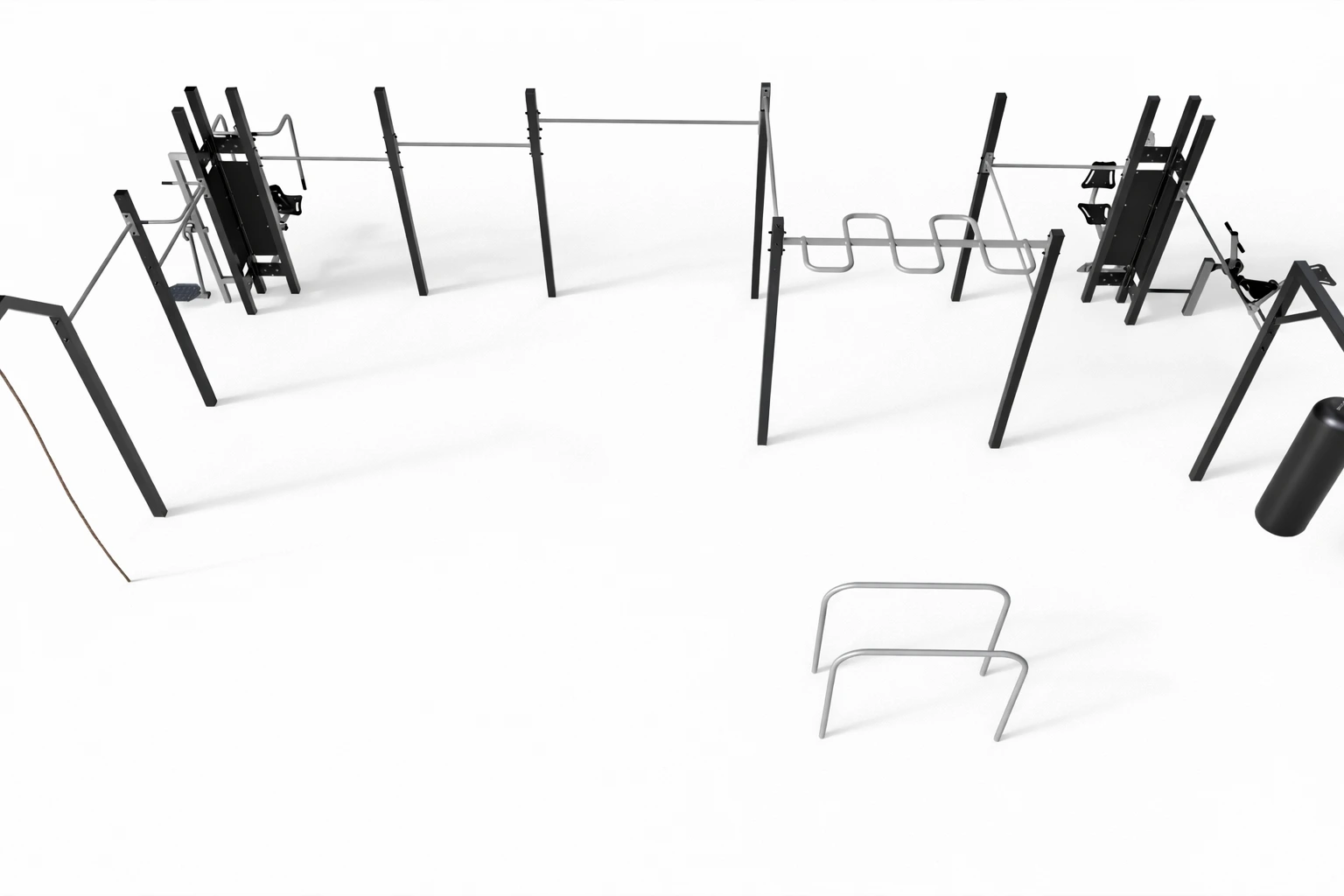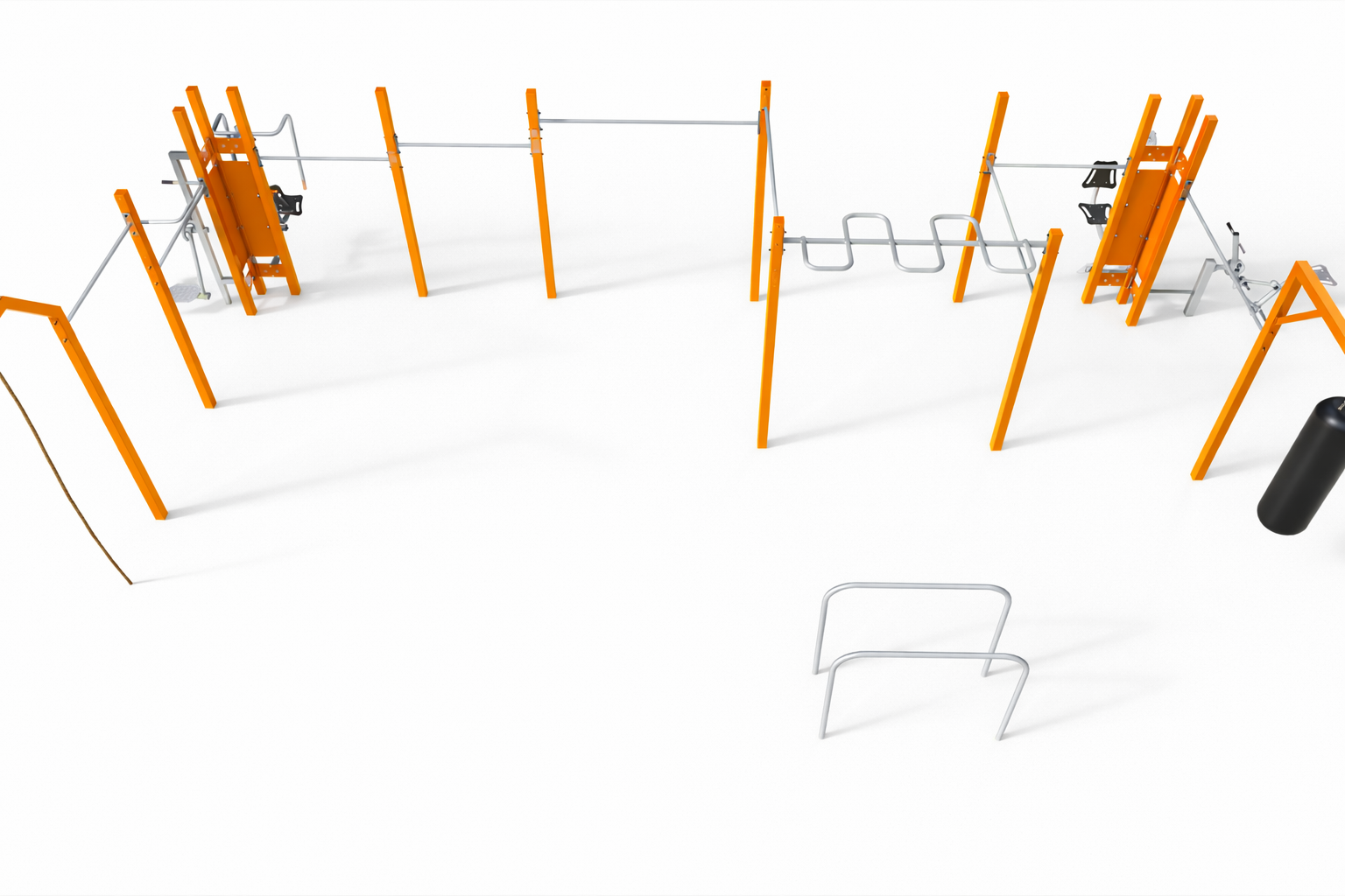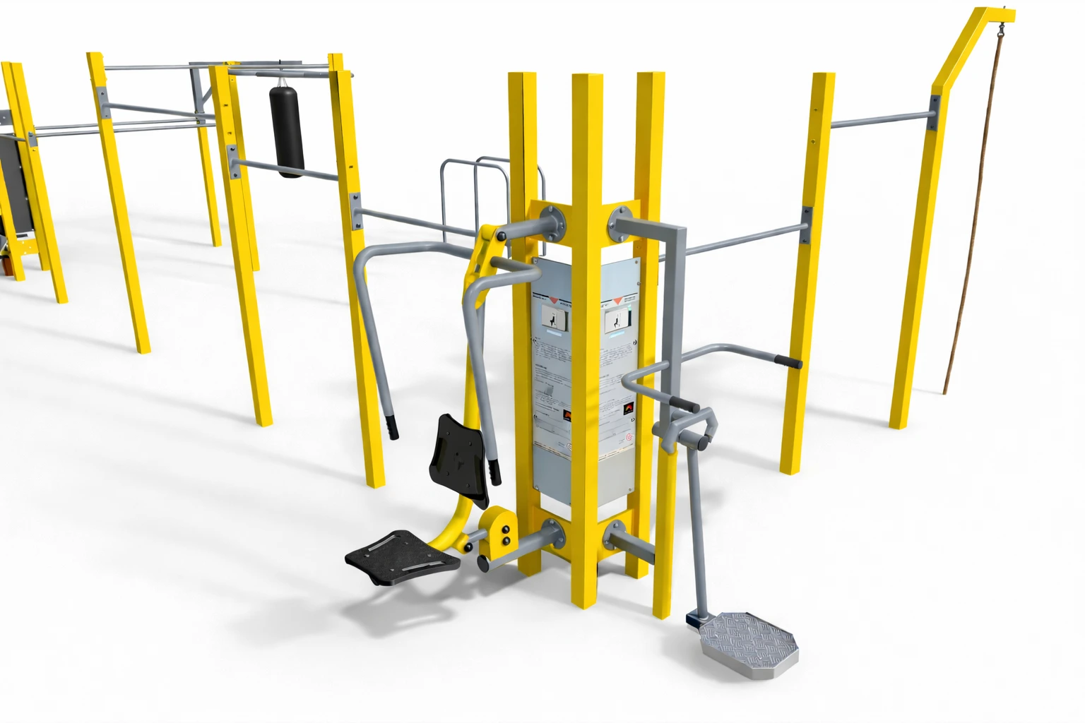 The Multi Outdoor Park set is fully configurable. Different fitness stations from the FIT series can be attached to the pylons, allowing the set to be customized according to the project needs. The final configuration may include any compatible machines, not only the ones shown in the visualization.