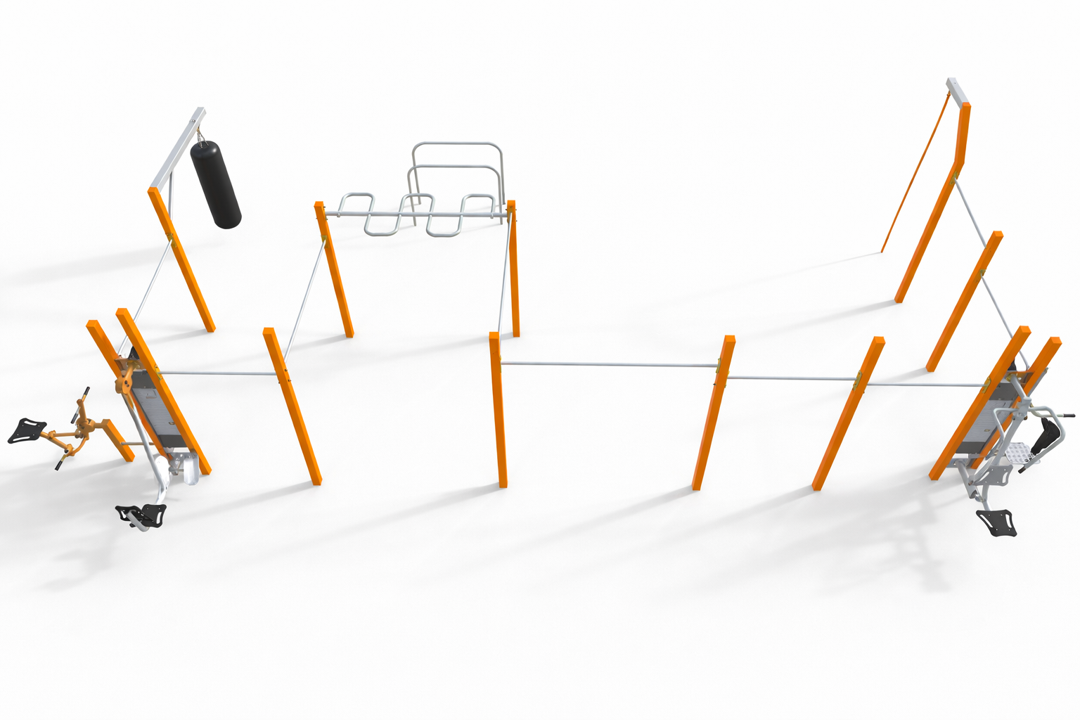 Multi Outdoor Park 2 – multifunctional outdoor fitness set that combines street workout structures, functional training elements and outdoor gym equipment. With features such as a climbing rope, punching bag, balance stations, parallel bars and strength machines, it enables dynamic full-body workouts.