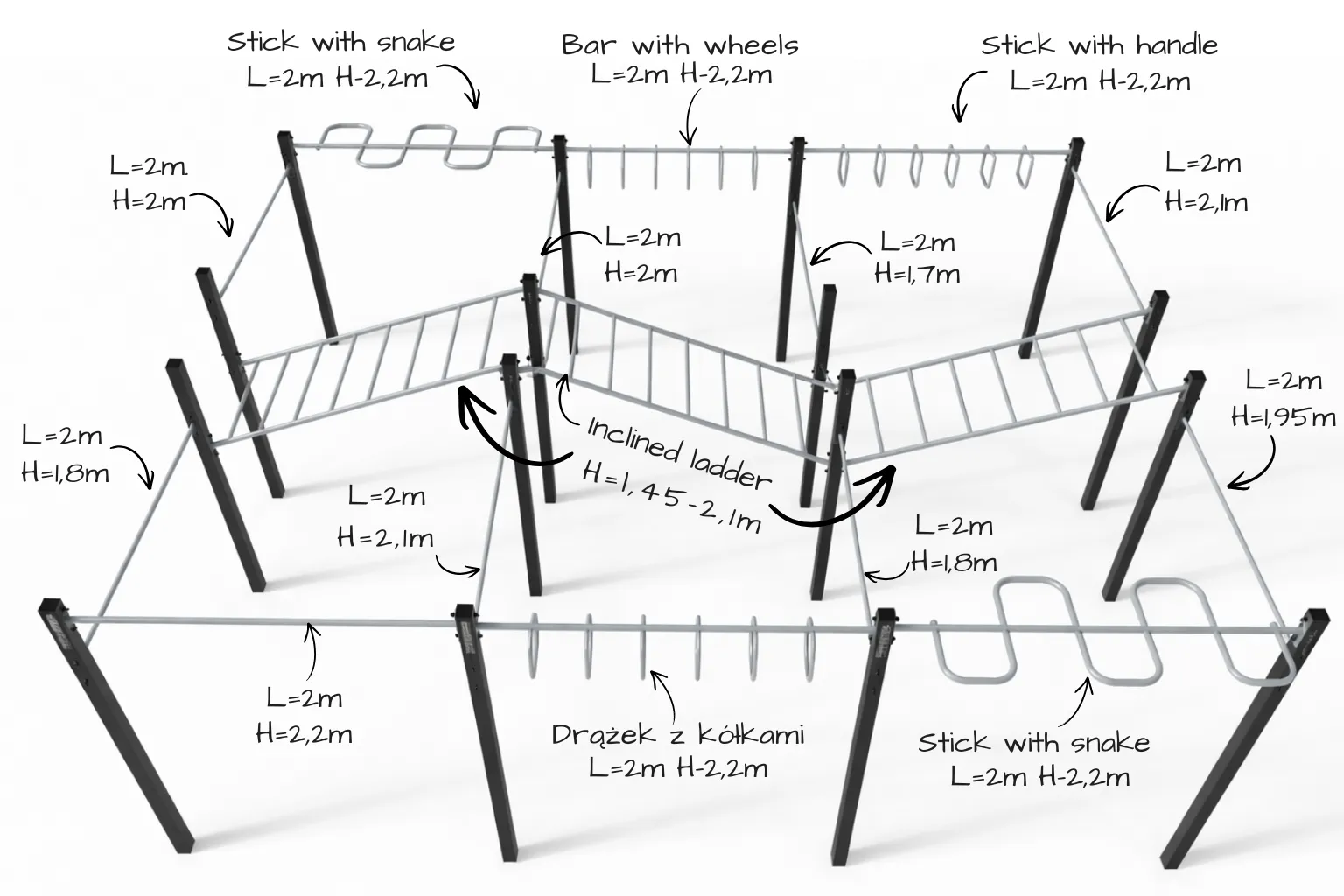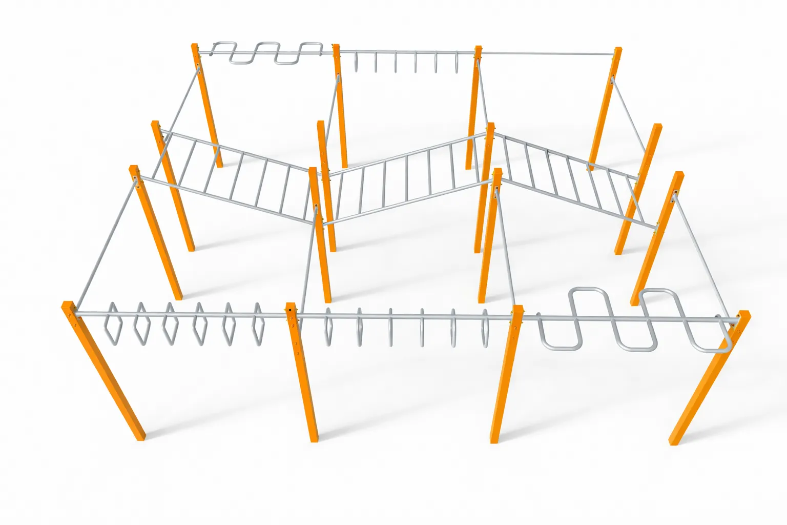 Multi Outdoor Park 5 – multifunctional outdoor fitness set designed for intensive calisthenics and functional training. With features such as inclined ladders, bars, grip elements and multi-height pull-up bars, it enables advanced upper body workouts, coordination training and dynamic movement exercises.