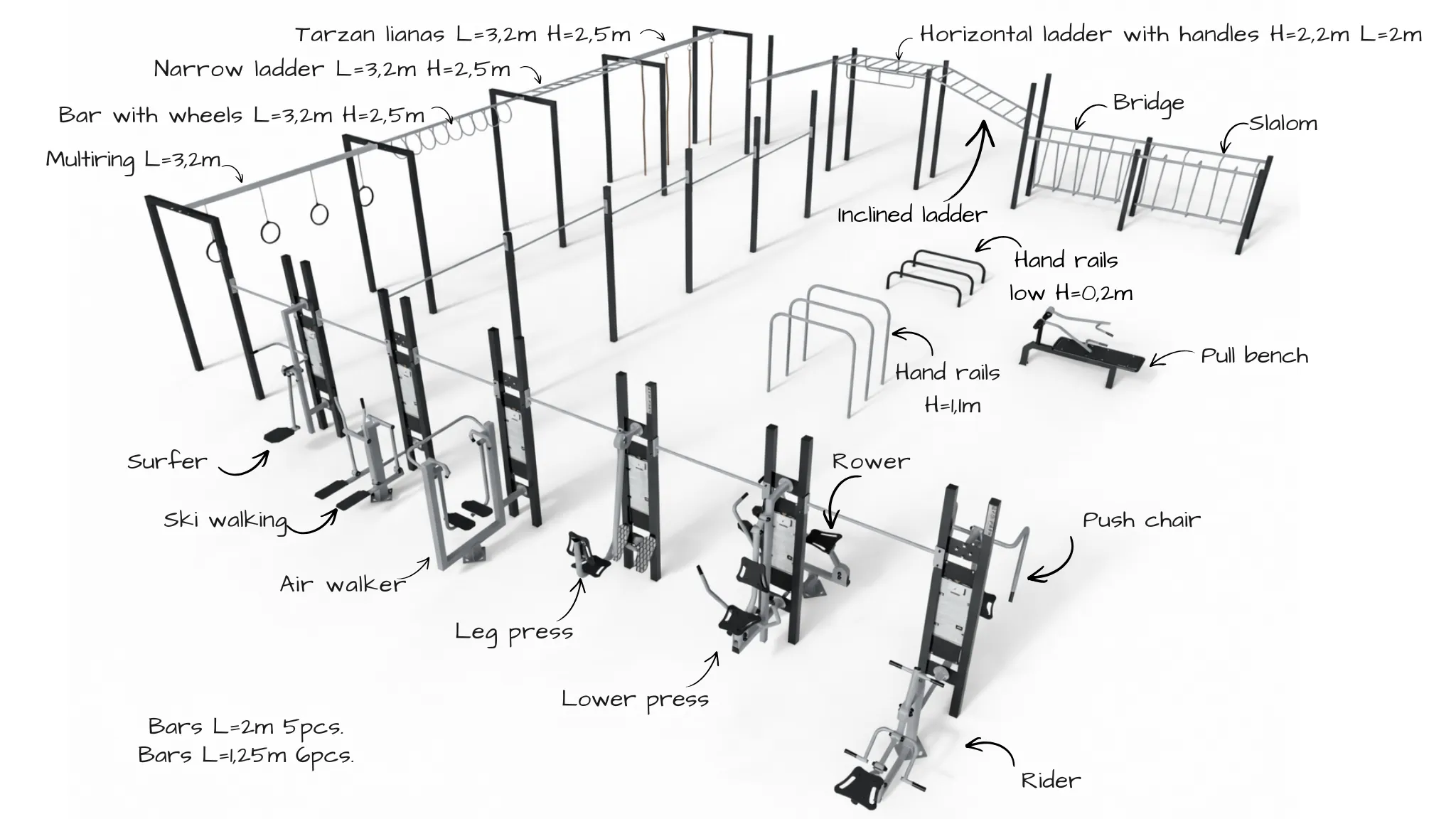 The set includes the following street workout and ninja track stations: