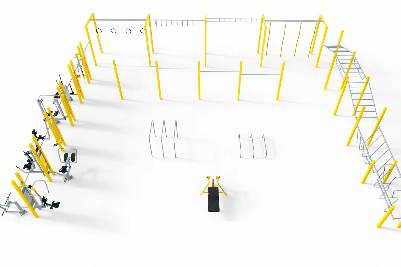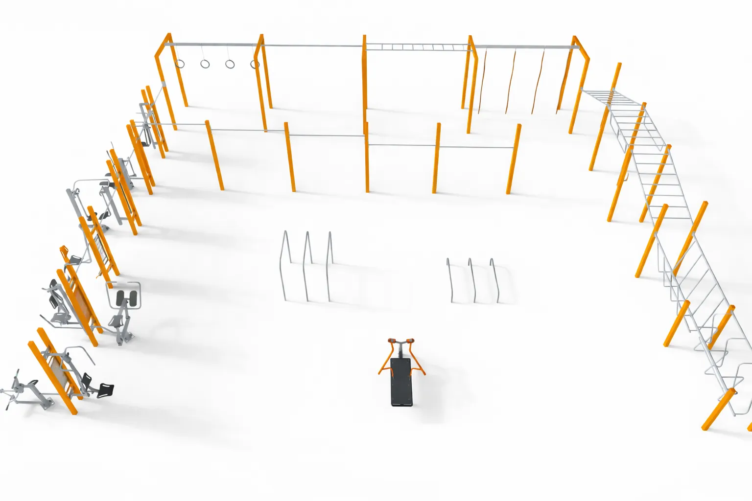 Multi Outdoor Park 7 – large-scale outdoor fitness zone combining street workout structures, ninja tracks elements and outdoor gym equipment. With a wide range of features including climbing elements, balance obstacles, cardio machines and strength stations, it creates a complete outdoor training zone for intensive, group and multi-generational use.