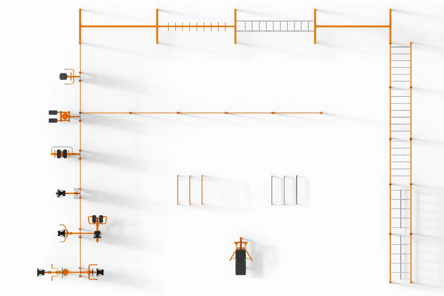 The Multi Outdoor Park set is fully configurable. Different fitness stations from the FIT series can be attached to the pylons, allowing the set to be customized according to the project needs. The final configuration may include any compatible machines, not only the ones shown in the visualization.